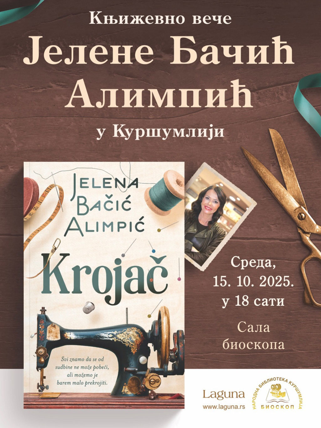 У организацији Народне библиотеке Куршумлија, у среду, 15. октобра 2025. године у 18 сати, у сали биоскопа, биће одржано књижевно вече са једном од најчитанијих српских списатељица – Јеленом Бачић Алимпић.