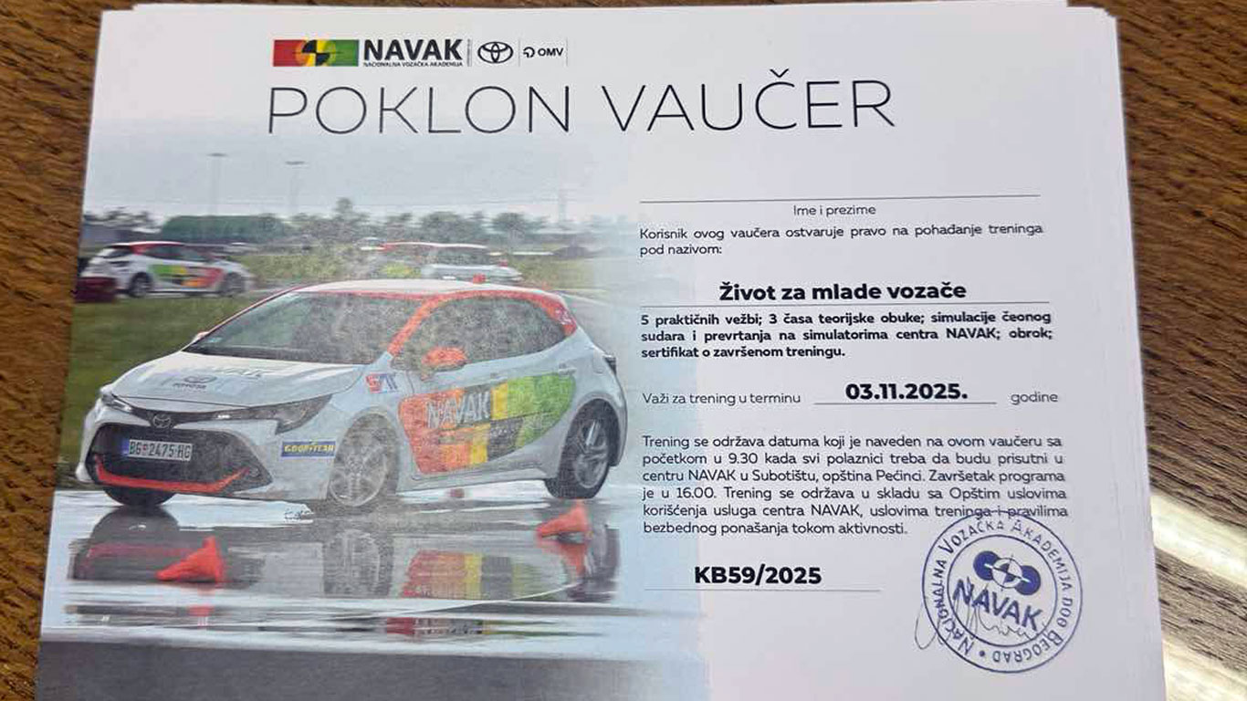 Ваучери омогућавају бесплатан тренинг у Националној возачкој академији (НАВАК) под називом „Живот за младе возаче“. Програм обухвата пет практичних вежби, три часа теоријске обуке, симулације чеоног судара и превртања, као и издавање сертификата о завршеном тренингу.